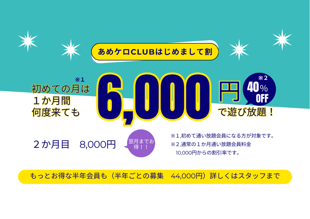 あめかえるには「あめケロCLUB」というサブスク会員制度があります。この通い放題プランをもっと多くの方に体験してもらいたい、ということで、「はじめまして割」を始めます。なんと初月は一か月通い放題6,000円!!通しで遊ぶなら2回来たらもとが取れちゃいます。この機会にぜひあめかえるにたくさん遊びに来てください。